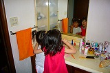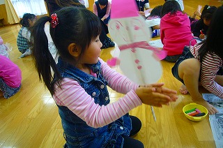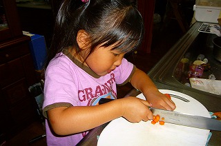 夕方、夕飯の準備が終わった頃ハルルが台所に来て、「ピーマンを切りたい」と言い出しました。、、と、言うのも、昨日夕飯の準備が終わった頃に同じ事を言われて「今日はもうご飯の支度が終わったから、明日の夕ご飯の時にお手伝いしてね」と言った私の言葉を覚えていたようなのです。まさか覚えているとは思わなかったので、今日もすっかり夕飯の準備は終わっていたのですが、ハルルがやりたいと言っているのでピーマンを切ってもらう事にしました。ピーマンだけ切ってもらうのももったいないので、「野菜炒め作ってくれる?」と、お願いすると、大喜びで「ぜーんぶ1人でやる」と言うので、出来る限り1人でやって貰う事にしました。先ずは、ハルルが切りたがっていたピーマン。「左はネコの手、包丁は前後ろ」 2人でつぶやきながら切っていきます。にんじん、きゃべつ、しいたけ、たまねぎ。たまねぎを切る時、まだ背が低いハルルの顔の位置と玉ねぎの位置が近くて「めがいたいよー」と苦労をしていましたが、(私が手伝いました)何とか野菜を切り終えました。フライパンを熱し、油を入れて、ひき肉をハルルが炒めます。私が野菜を入れて、ハルルが野菜を炒め、お塩とお醤油で味をつけました。仕上げに私がごま油を垂らすと、「これで美味しくなるね」と、ハルル。なんだか、随分お姉さんな事を言うようになりました。ハルルのおかげで、1品増えました。本人は、味付けの塩を自分で入れたことが嬉かったようです。(塩加減は私)ハルルが作った野菜炒めごりっとした食感の野菜があるのも御愛嬌。ハルル、とっても美味しかったよ。