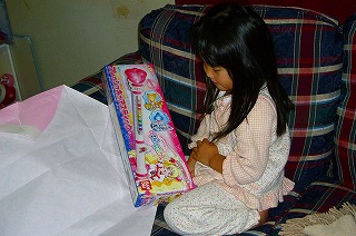 朝起きると、ハルルとユユにサンタさんがプレゼントを置いていってくれていました。サンタさん来たんだね~、、と、布団から出て早速プレゼントの包みを開けると、ハルルがお願いしていた「キュアスティック」が、届いていました。ハルル、大喜び!!ユユには、本を引っ張ったり、引き出しを引っ張ったり悪戯ができるおもちゃが届きました。2人ともよかったね。