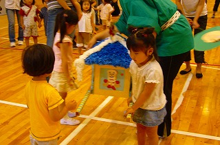 今月の遊ぼう会は、夏祭り。まずは、お友達とおみこし。わっしょいわっしょい!次は紙のお金を貰って、出店を体験しました。魚釣り。くいきんぎょすくい輪投げチョコバナナも買いました。