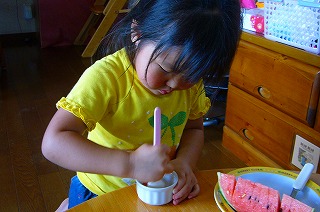 そろそろ離乳食を始めても良い月齢ですが、ユユはもう少し様子を見てノンビリ始めようと思っています。でも、そろそろスプーンの練習を兼ねて果汁を上げ始めました。今日は始めてのスイカです。ハルルがスイカを潰してジュースを作ってくれました。あ~ん、、、ユユはスイカジュースを気に入ったらしく、美味しそうに飲んでいました。