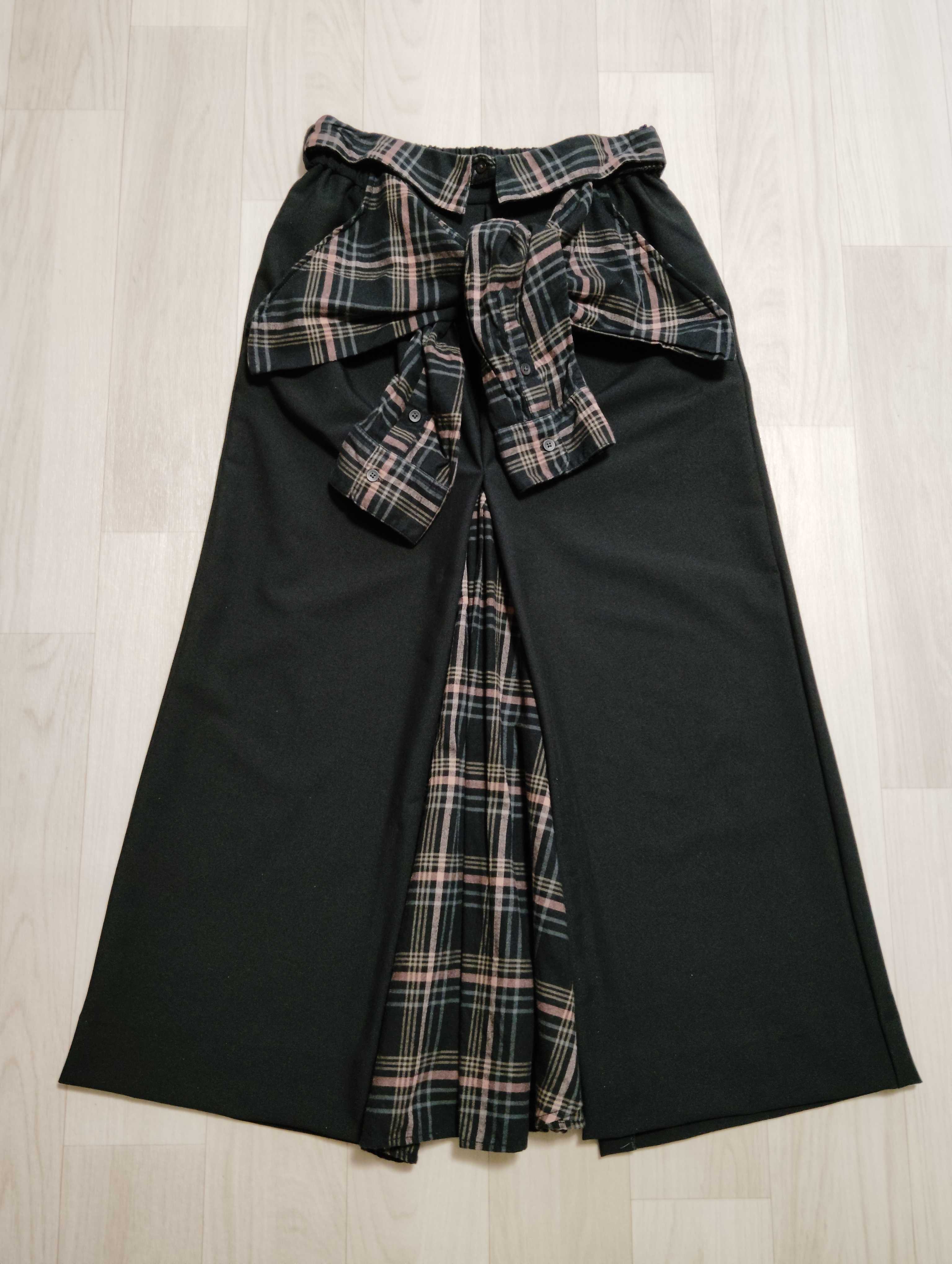 以前仕事用で履いていた黒のワイドパンツと家族が要らなくなったというチェック柄のシャツを合わせたら、素敵なスカートに仕上がりました✂️洋裁本の型紙から服を作ることはあったのですが、リメイクに関しては経験も技術もなくノープランでしたがどうにか形になりました✨️ウエスト部分には襟を付けたいな〜と考えていたのでこんな感じで💡ちなみに台襟部分を切りっぱなしにしたものをサイドに縫い付けただけシャツの前ボタン部分はスカートの後ろ側に縫い付けましたスカート前中心の縫い目が少し不自然になってしまったので、そこをカバーするためにシャツの袖部分を前で結ぶデザインにしてみましたするとお腹周りも自然とカバー出来る仕上がりに✨️シャツの袖付け部分のラインがポケット口の斜めのラインにちょうど合いそうだったので、思いついたまま縫い付けましたなんやかんやで時間はかなりかかったものの、そのままでは着る機会がなかったであろう服が自分好みの一着に生まれ変わりました🍀ちなみにシャツはユニクロ購入品のようでした黒のパンツは履く機会が無くなってしまいましたが、仕事用としてはとても履きやすくて良かったです私はウエストは細めですがお腹がぽっこりなので、タック付きのウエストデザインがお気に入りでした😊これからはスカートとしてまたどんどん活用していきたいと思います♬