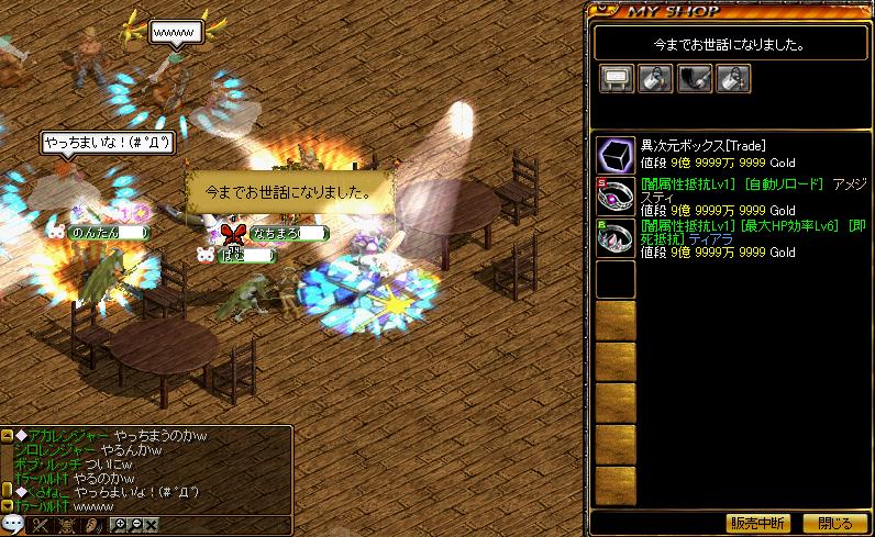 異次元は結局HP月光にしました。これがあればよちまろのGVがダイブ楽になりますね^^…あればね。。。見事にn鎧になりましたよwコツコツ築き上げてきた全財産20億円が吹き飛んだわけであります。というワケでそろそろ撤収準備に入ります。まあ異次元失敗が直接的な要因ですけど、やっぱり狩場不足と今回のMOB強化が理由かなぁ。ドロップ効率悪いし、良品落ちないし、きっとLVが上がってもこの流れは変わらない・・・むしろ悪化していくのだろうなぁと。今後は、身の周りのもの売り払って、異次元を敢行し、いずれは引退の予定です。4/4で課金も切れるしね。奇しくも今日は3/31。卒業宣言にはふさわしい日じゃありませんか><;引退オクするほど有名人じゃないので、こっそりと露店売りと身内にプレゼントして終了かな。お世話になったみなさん、ありでした。
