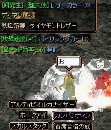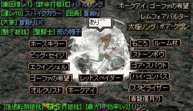 その男はやさぐれていた。ロトで大惨敗して。(欠けてるとこは破壊したランク鎧)GVでファミに4回も殺され2000P↑献上して。で、男は異次元してみました。今回は全財産突っ込んで2本立て。お、Sアメジ残った!!!!この時点で50%クリア。。どきどき。。。やたぁぁぁ~^^bみんなが盛大に祝ってくれました。今回は重複オプションとか考えずにシンプルにいったのがよかったのかな。2つめの異次元は次回に持ち越し。通算成績:1勝2敗