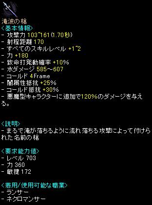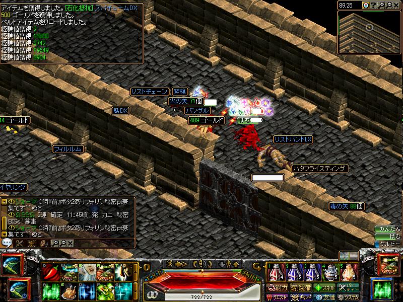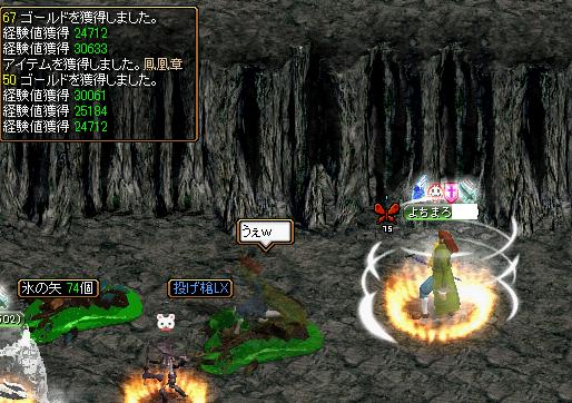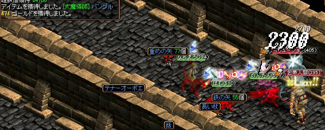 異次元の模様をSSつきで再編集したので見てね^^で、次なる異次元のお金をためるべく再出発したわけですが・・・忙しくて秘密しかできん…T_Tまあどんなに忙しくても気合で秘密だけはやってるわけですがwそんな中、夜中の3時にポタだしを終え、町に戻ろうとした私。間違えてなぜかモリ2Fにw狩場が空いていたのと、明日も遅くなるから辛子使いきらないなぁ…と軽く狩ってみました。お、大魔道バングル、ゲット!普段はバングルなんて拾わないんですが、マウスが滑ってとってしまったwらっき~^^vしかし、その夜の奇跡はそれだけでは終わらなかったのです…2つ目のDXUゲット!!しかも、なんだかかっこいい名前。イメージ的に弓かな?なんだ、矢か…ちょっとがっくり。ん?んん?んんん?よくよく見ると、この矢。。。すげー、つよくね?力+100知識+140水弱化25%って…氷雨の最終装備だよね^^;装備LVはあれだけど、秘密卒業組ならパッチでいけるし。こ、こ、こいつぁ~きたぁ~!!!というワケで、異次元再チャレンジの日は一歩近づいたのでありました。現在、引き取り手募集中。相場不明です。