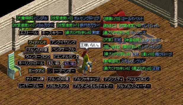 ふと冷静に思ったんだが、異次元なんてする金あったら、よちまろの狩り装備強化して、モリネルの550~のMOBでアイテム狙ったほうがいいんじゃまいか・・・こないだSSとってたんですが、550↑にしては相当な乙装備…鋼杖DX攻速27%って…(40%↑買えよ)そのほかの装備もHP87%クィレスとか…健康比率2/12金靴だったり…まともに狩れる装備ではございません。。。チリメインなら最低6フレは欲しいところ。ということで現実的な装備を考えてみました。杖:攻速40%鋼杖DXブロ:攻速13%低下65%サビリオラDX首:運比スパイクカラー頭:N権勢背:Nホワイトオーラ腰:運比アンチ手:箱バン鎧:自リロセーフ足:大道各種抵抗は指で稼ぐとして。これで40+13+42+39-5=攻速129%で6フレ。うーん、これだと運が800↑くらいしかない。。。しかもHP低そう…最悪頭はHPアメジに。足が運比大道になればいいが、厳しそう。アンチも作らなきゃだし。ちょっとだけ理想をいうと、杖:攻速50%鋼杖DXブロ:攻速18%低下70%サビリオラDX首:攻速20%勲章XLS頭:運比権勢背:HP65%ホワイトオーラ腰:運比アンチ手:箱バン鎧:HP97%セーフ足:運比大道攻速167%で5フレ。運1100↑HP効率162%。まあ無理だなぁ。異次元4回成功・・・以上妄想でした。