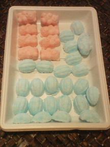 もらいものバスボムが可愛かったから!自分でも色つきの可愛いヤツを作りたくなって。。。食紅で赤と青をつけて、チョコレートのモールドでベアとアーモンド型に。固くしっかりしたボムになりましたんが、いかんせん作りすぎた・・・で・も容器に入れたらカラフルで可愛くなりました