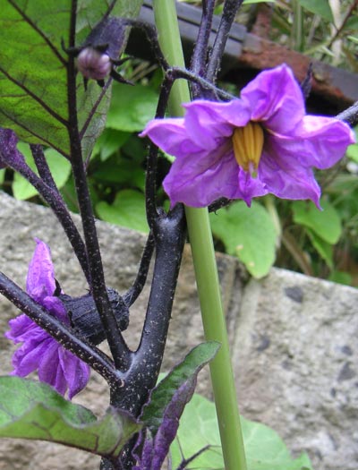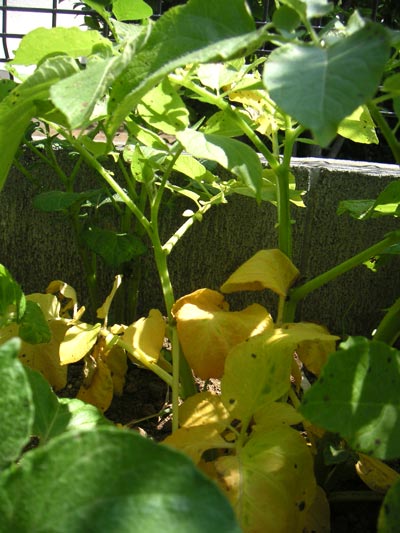 おはようございます!今日はどんよりと曇り、午後から雨の予定です。雨が降る前に日課の花壇菜園の見まわりを。。。【ナスの横にパセリを植えています。今のところ害虫被害は全くありません!】昨日まで大きな蕾だったナスの花が開いていました。紫色の可愛いお花です。でも、付け根の部分はしっかりとナスのヘタです。 しかし、野菜って面白いですなぁ! 普段はスーパーで売っている完成?したものしか見ていないけど、成長の過程が見られると、改めて「なるほど~ぉ! こうやって大きくなったなぁ~、そうだったなぁ~。」とか、「野菜でも生きているもの(命)を頂いているんだなぁ~」と思います。 本当に花壇菜園(家庭菜園)は、家庭で出来る教育ですねぇ。家計の節約にもなり、尚かつ食育にもなるなんて、一挙両得?です。。。 お次はコレです。何だかわかります?? コレ、ズッキーニなんですが。。。 葉以外のこの部分は何? もしかしてもう花が咲く気? ちょっと! ついこの間定植したばかりなのに今、花が咲いて実を付ける気なのかしら? あなた! 今はまだそんな体力無いんじゃないの? と思っているんですが。。。 だって、本葉は手の平サイズが4枚程度。。。 この対処法を調べてみようと思っています。ズッキーニ農家の方やベテラン菜園人(さいえんびと)の方で対処法を知っている方がいたら教えて下さい!【約70日のじゃがいも】
