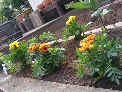 おはようございます。久しぶりのブログ、随分更新できずにいた気がします。その間何をやっていたのかというと、コレです。 新しく花壇を作っていました! 上から撮るとこんな感じ! 門から玄関までのアプローチ部分でもあるので、テーマは「花と野菜の共存」です。 「なんだよ~、マリーゴールドじゃん」と思ったあなた! その通り! ただ単に害虫をなるべく見たくないからというだけなんです(笑)。。。でも、いつかうまく花と野菜の混植が出来て、いかにも家庭菜園ではなく「綺麗な花壇菜園」ができるといいなぁ~と思っています。皆さんもお楽しみにしててくださいね!あっそうそう、「スーパーかぼちゃ」のその後は。。。 今こんな感じになっています。もともと植えられていた場所は仮の場所だったので、植え替えを実施しました。がしかし。。。 まさか8個中8個、発芽するとは思っていなかったので、東と南側のフェンスを活用しても余る状態。とうとうちょっと大きめのテラコッタの鉢4個もかぼちゃ生育に使用することになりました。あんどん仕立てにしようと思っていますが、さてさてどうなることやら。。。これまたお楽しみにしていて下さいね!