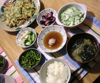 おはようございます。昨日の夜up出来なかった夕食を、ちょっと重いけど朝からup!ゴーヤとたまねぎとじゃがいものかき揚げゴーヤときゅうりのサラダピーマンのラー油、塩コンブあえぬか漬け(きゅうり/大根)ナスの梅酢漬けワカメと大根の味噌汁ブログでも紹介しましたが、この間作ったぬか床が大活躍中です。ほんのり風味も出てきて1日で程良く漬かるようになってきました。そして、suirobi2さんに教えてもらったナスの梅酢漬けが驚きの変身を見せました。1日経つと、更に味がなじみ、色も綺麗に染まって一段と美味しく、美しくなりました。ナスの皮から色が染まったのか? 劇的な変化なので、是非昨日の写真と見比べてみて下さいね! この色はお弁当の色どりにピッタリだと思いますよ!レシピを知りたい方は、suirobi2さんのブログで写真付きで、丁寧に料理方法を教えてくれているので訪問されてみて下さいね!後ほど本日の収穫もupしますので、また御覧下さいねぇ~!**************************************細切り塩こんぶ100gナス苗 千里長茄子 【実生苗】**************************************