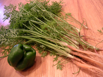 こんにちは!今日も良い天気ですね! でもだいぶ秋らしくなってきましたね! 今日も相変わらず、朝5時からニャン太に散歩に誘われ、窓を開けて外を見ると、もう秋の虫の声が聞こえてきます。 これから寒くなるのかなぁ~。。。さてさて今日の我が家の収穫は。。。 ピーマン1個とニンジンの間引き菜です。写真が赤くて見にくいかもしれませんが、ほんのりと根がニンジンらしい色になってきました。 本場5枚ぐらいの間引きが最終と書いてあったので、間引きは今日で終了となりそうです。 これで後はニンジンが大きくなってくれるのを待つばかりです! 初ニンジン!上手くいきますように!さてこのニンジンの葉、どこかで嗅いだ事があるような匂いが。。。 小さい時に田んぼの近くにあった「セリ」に似た匂いがします。不織布をかけていた事もあって、まったく虫も付いていないし、もったいないので料理してみました。 軽く茹でて、『胡麻和え』にしました。昔「セリ」を和え物にして食べていたのを思い出したので。。。 ちょっと癖がありますが、なかなか美味しかったですよ!他にどんな食べ方があるのかなぁ~。 何か美味しい食べ方があったら教えて下さいね!**************************************畑から新鮮直送だから選べる有機にんじん(葉付き/葉なし 1kg:約5本前後)ふしぎな 人参葉茶 50g×3袋【冷凍製品】【クール便】ホットドッグ にんじんのモンブラン**************************************