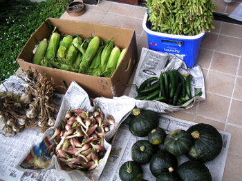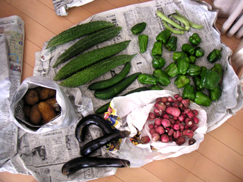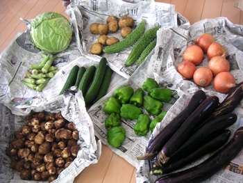 こんにちは!しかし、雨が恋しい今日この頃ですよねぇ~。毎朝、毎夕の水やりをやってもやっても「しんな~り」して、微妙に元気がありません。今我が家の花壇菜園で一番元気なのは「さつまいも」!秋の『イモ掘り』が今からとっても楽しみですよ~。良く考えると、『イモ掘り』なんて何十年ぶり?になることか・・・。腰痛めないように気をつけなきゃなぁ~。さてさて、今日の収穫はなし!だけど、私の九州の父から支援物資が届きました。。。 今回のメインは『長ナス』と『サトイモ』らしいです。またゴーヤもあるし。。 これで、うちの冷蔵庫にはゴーヤ7本ありますから。。。 まぁ、それでも感謝、感謝です!写真の左下に小ぶりなサトイモが大量にありますが、この小さめサトイモの美味しい食べ方があるんです。とっても簡単なので、近いうちに作り方をupしますね! お楽しみに! そうそう、今日近くのホームセンターで買ってきましたよ~。何をってコレ! 良く見ずに買ったので後で気付いたんですが、中国産だったんですよねぇ~、残念! でも、今年から我が家で育てれば、来年の収穫の時には立派に「日本産」になるのかな?ん? コレってスーパーの野菜にもこんな事がありえるのかしら? 同じような話がアサリやウナギで効いた事があるような。。。 まっ、そんな事言っていたらきりがないし。。。 でも、心配!という事はやっぱり家庭菜園は良いのかも! 自分で作ってるんだから、何てったって信用出来るし。。。 日本の食料自給率も上がるし、CO2削減にも役に立つし 良いことだらけ!? という事で、秋野菜も皆さん頑張りましょうねぇ~!*************************************** 無臭ニンニク小袋詰 約80g入(国産)島らっきょう小袋詰 約120g(国産)エシャロット 小袋詰 約220g(国産)【FGP0821_10】***************************************
