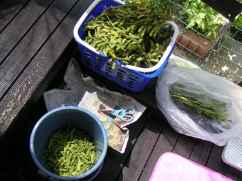 おはようございます。昨日はちょっと息抜きにお出かけ! upできずにすみませんでした~。昨日の収穫はといいますと。。。 もうそろそろ撤収しようとしている『空心菜』を半分収穫! もやしと牛肉と一緒に辛~い炒め物にしました。辛かった~!さて、皆様『枝豆の下処理』がやっと終わりました! 何と2日がかりでした。経過をご報告しますと。。。 結局、枝からさやをはずし、このバケツに水を入れてザブザブ洗う作業までで、既に14時。 バケツで見るとピンとこないですよねぇ~。洗った後の写真はこちら! 山盛りボウルで4つ分になりました。仕訳を始めにしようと思ったんですが、そんな事言ってられん! 早速、寸胴鍋とパスタ鍋を使って茹であげます。冷凍保存にするので硬めに茹でましたが、なんせ大量なのでゆで時間5分で統一しました。この後がすごかった! 茹であがった枝豆を冷ますのに台所の流し台では狭すぎる! なので、お風呂場へ直行です! この作業が終わった時には、既に16時。。。 ご飯の用意しなきゃ! ということで一時中断!茹であがって水切りをして、さぁ~て気の遠くなる作業開始。ここからが2日目ですね。見た目も綺麗で、中の実もしっかり入っているものを選別し、水気をしっかりとふいてジップロックへ保存! こんな感じですね! これはビールのおつまみ用(お客様にも出せる用)。最終的にこの状態のものが6袋できました。そして虫食いの後やちょっと茶色くなって、見た目が悪いものはひたすらさやから実をとりだし、たまにムクムクが中にいるのを見てしまい、『ヒィ~』と思いながら、その枝豆を放り投げひたすら剥きます。そして出来たのがこれ。。。 スゴイでしょ~。この袋は結局8袋つくりました。このまま冷凍! これは枝豆ごはんを作る時やスープを作る時、ちょっと緑があった方がいいなぁ~て時用ですね。いや~本当に疲れた!私頑張った!でもまだ支援物資あるし。。。次の食材がまっているし。。。私、頑張る!***************************************「大福城 じんだん大福」白餡に枝豆を混ぜた山形県庄内の和菓子です【豆しば】枝豆しば&虎豆しば★豆しば ダイカット消しゴム2個セット冷たいミルクを注ぐだけで簡単おいしい冷たい枝豆のスープが出来上がり!パパはビール!ボクはスープで!みんな大好き枝豆を食べよう!粗挽きの枝豆が冷たい牛乳と溶けあってクリーミー♪新しい美味しさ!フリーズドライ冷たい枝豆のスープ(3食) 10P21Jul09***************************************