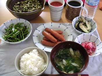 おはようございます!今日は久しぶりに夏らしい! 太陽が眩しい! これでなくちゃねぇ~夏は!さてさて、今日の我が家の収穫はといいますと。。。 例のごとく「ゴーヤ」があります。我が家の冷蔵庫の中には5本あるぞ! おとといは旦那のリクエストで、肉詰めにして2本消化したのに、まだまだあるぞぉ~! ゴーヤ茶でもつくるか? ちょっと悩もうっと。。。今日は特別に? 我が家の朝ごはんをご紹介。。。ワカメと大根の味噌汁ゴーヤときゅうりのサラダピーマンとベーコンの生姜炒め山芋とオクラの納豆ナスの梅酢漬けトマトジュース&水というようなメニューで、ほとんどが先日父から届いた野菜です。ありがたやありがたや!え~実は、私がお気に入りブログに登録してる『トロ箱栽培日記のsuirobi2』さんところで、ナスが収穫されるといつも話題に出てくる「ナスの梅酢漬け」がとても美味しそうで、先日レシピを伝授していただきました。昨日梅酢を買ってきたので、こりゃ~作らねばと! そして朝からハリキッて作ってみました! ほんのり薄ピンクで綺麗です! 食べてみると、夏にピッタリの爽やかな味。 ん~、お・い・し~い! 今度はちょっとアレンジして、大葉を加えてみようかなぁ~。茗荷もいいかも。。。 本当に夏らしい浅漬けでした!suirobi2さん、そしてsuirobi2奥さま、本当に有難うございました! **************************************無双本舗 有機・梅酢(赤)360ml健康のためなら(無農薬・無添加)完熟トマトジュース180ml10P27July09このトマトジュースはそんじょそこらのトマトジュースと違いますよ! 一口飲んで思わずラベルをガン見してしまいます! 『なんだコレわぁ~~~!』と。。。1本400円ぐらいするので本当に高いけど、本当に一度飲む価値はあります。うちの旦那はいままで一番美味しかったトマトジュースはこの「北海道余市の江本自然農園」のこのトマトジュースだそうです。。。**************************************