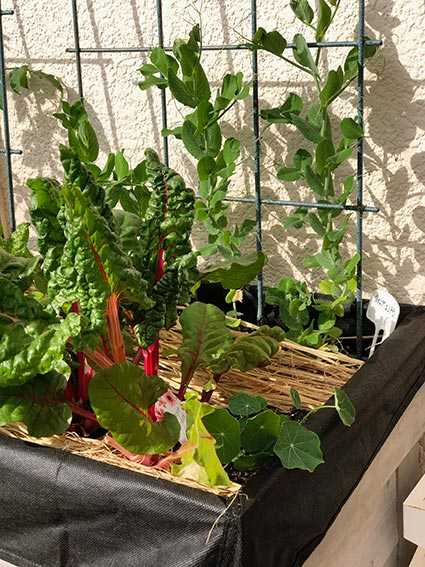 玄関横のベジトラグにはスナップエンドウとスイスチャードの間にふちに沿って定植。