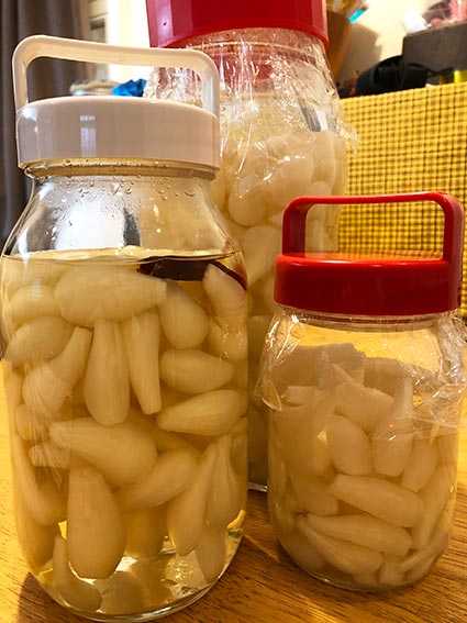 1年分の旦那用「ラッキョウの塩水漬け」&私用「ラッキョウ甘酢漬け」をつくります。