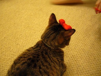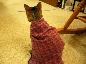 あ…この“旅のお侍さん”のようなうしろ姿は・・ 「・・・」ププッ ^m^ やっぱりめぐ~~か~っこいぃ~! めぐ 「あの・・・」めぐ 「なんか貧乏くさいにゃ」お洋服は高いからこれで我慢してちょ~だいね。それに、ハンカチ王女♪って感じで素敵ですよ めぐ 「王女?素敵?」 めぐちゃん、褒められた(?)のが嬉しかったのかな・・しばらくこんなふうに ハンカチ引っ掛けたままウロウロしていました。(≧m≦)ププッ