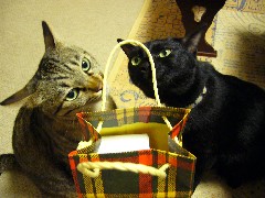 いつもコメントをくださるモモねこさんの素敵なブログ「くろねこ生活」が50000HITを達成されました!その記念抽選会に私も応募させて頂いてたのですが、先日タロウ君による抽選会が行われ・・・な・なんと私が当選しました!!ヽ(^○^)ノ わ~い 昨日、モモねこさんから素敵なプレゼントが届いたのでご紹介します。(写真をとったのが夜なので、全体的に画像が暗くなってしまってます)めぐ 「私のテーブルに見慣れにゃいものが…」早速、めぐ隊長のチェックが入ります。黒猫ちゃんのガムテープ♪(さすがモモねこさん おしゃれだなぁ)中にはモモ&タロウちゃんの写真のメッセージカード そしてちりめん黒猫ちゃん!すっごくかわいい~~嬉しいな他にもじゃ~~んこんなにたくさん。。めぐとななのおもちゃに、ねこ雑貨、飼い主用のおやつまで……モモねこさん、本当にありがとうございます!!ほらほら、めぐとななもモモねこさんにお礼を言ってくださ… いよ……めぐ 「透明袋は楽しいにゃ♪」って、お~~い! (;´o`) はぁ~やっぱり猫ですね。ちりめん黒猫ちゃんのラッピング袋に夢中。。。あれ?ななはどこだ??( ̄m ̄*)ププッはまってる・・・・ま、猫だから仕方ないかぁ。。。(あきらめモード) では気を取り直して・・・キュートな黒猫紙袋の中はおもちゃがいっぱい。タロウちゃん大のお気に入りのラメボンも!めぐ 「青のラメボンで遊ぶにゃ☆」楽しいおもちゃがいっぱいでよかったね~~。んん?? なな「めぐにゃん、その袋は空っぽにゃよ」 「空っぽっていってるのに…」あ~あやっぱりこうなりましたか…(*≧m≦*)ププッ我が家のすっとぼけ姉妹に代わって、飼い主が心よりお礼申し上げます。とっても素敵なプレゼント、ありがとうございました しかし、50000HITってすごいですね~。さすが「くろねこ生活」!私は50000は不可能なので・・・とりあえず10000HITをめざして地道に頑張ろっと…(笑)