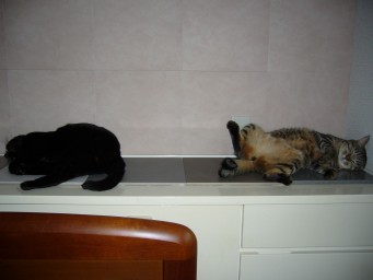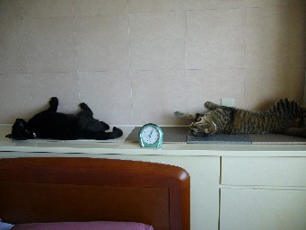 7月に入りました。夏本番ですね。これから益々暑くなるというのに、昨日寝室のエアコンが壊れました・・悲しすぎ。。。はぅ 外出先から帰ってくると、必ずにゃんこが玄関でお出迎えしてくれるのですが、先週くらいからドアを開けても姿がありません。。何故(?_?)そーっと部屋に入ると「暑くてお出迎えなんてしてられにゃ~い」・・・・(寂し)確かに。。。先週半ばから本格的に暑くなってきたからなぁ。全室カーペットの我が家では、にゃんこがひんやり過ごせるのはここと玄関、あとはガラステーブルのみ。。動きたくないのもわかるような・・・で、めぐとななの暑さ対策をなんとかせねば!と思っている頃なんと、夫が知り合いから大理石風タイル(大きいのを7枚も!)をもらってきてくれましたわ~いわ~い早速リビングに置いてみます。ポツ~ン2匹とも警戒モード全開。なかなか上に乗ってくれないので ヒモを使って誘導・・・めぐ「あれ?遊ばにゃいの?」あっさり乗っかってくれました。(単純)冷たくて気持いいでしょ~~ なな「冷たいにゃ~」 めぐ「まぁまぁにゃ」 「いい感じにゃ~」(ななちゃん頭おちてるよ^m^)とりあえず、受け入れてもらえたようで良かった良かった♪あとは自主的に乗ってくれる事を祈るばかり。。。ちなみに・・1枚だけキャットタワーにも置いています。(板でしっかり補強しました)こちらはまだあまり活用されていません^^;今後に期待?です。。。