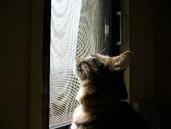 網戸越しに一生懸命虫を追うめぐ。。(逆行の為写真が全部暗いです^^;)めぐ 「虫」 洗面所の窓に登るの珍しいな~などと思って見ていると・・・ 急に立ち上がりました。どうやら虫を捕まえる気になったようです。めぐ 「虫さんを捕まえるのにゃ!」お~いめぐちゃん、網戸があるから捕れませんよ。 虫を捕まえようと必死に手を伸ばすめぐ(あ~あ、無理って言ってるのにぃ)でも、めぐちゃん…その格好めぐ 「う~ん、なんで」 めぐ 「捕れないのにゃ~~」なんか、仮面ライダーの変身ポーズみたいなんだけど。。ププッ