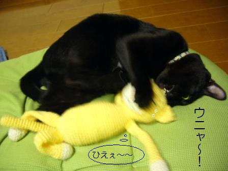 昨日帰宅して、にゃんこのトイレを掃除しようと洗面所に入ったところ、、、窓辺に飾ってあったあみねこの姿が消えていました。<参考画像>左下に写っているのが我が家の※あみねこ※こんなふうに座らせてました・・あみねこ拡大※あみねこ※Pinocoさん(ブログお休み中)のところのあみねこちゃん達があまりにも可愛くて母に頼んで作ってもらいました(自分では無理←編み物苦手)。母も初めて作った試作品なので形的に少々微妙ですが、、味があってとてもかわいいのですで、このあみねこが忽然と姿を消していたのです。下に落ちてもないし、どこを探しても見当たらない。。まさか歩いてどこかへ行った???なんてありえないことを考えながら探すこと数分・・・・・・・・ズボンハンガーの下で行き倒れているあみねこ発見。。。一体何故??どうやってこんなところに???と悩んでいる私の前に黒い物体が・・・なな「私が連れてきたにゃよ~」自慢げに現れましたどうやら犯人はななのようです。ここはななの隠れ場所でめぐはほとんど入らないので、ほぼ決定です。あみねこ「・・・ここは・・・どこ?」しかしこのあみねこ、お尻と手足の先におもりが入っていて猫にとっては結構な重量だと思うんですが。ななって結構力持ちなのねぇ。(ちょっと感心^m^) 最後に動画をひとつ・・・ななVSあみねこ(最初のほうだけです)またもや洗面所から連れてきていじめてました。。あぁ可哀想なあみねこ・・・