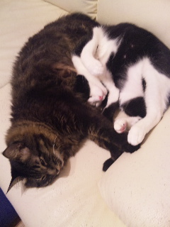 人見知りの激しい凜が… いつの間にかパソコンやってるおいらの足元で寝てた おしっおしっ^^可愛いのぉ~^^ しばらくして見ると~ にゃあ~が凜の顔を枕にしてる <<オマエーーそれでも母親かぁーーーー(ーー゛)>> でも寝てる凜… たまに足ピクピクさせて… 苦しいか?凜?!