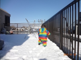 あっっっと言う間に1月も半ばを過ぎてしまったこの前の大雪は、すごかったなぁその翌日には、ベランダでかぁちゃんの雪遊びデビュー雪の上を楽しそうに歩いてる姿が、なかなかかわいい上半身で、しっかりとバランス取っているのが、おかしい本能なのかな?う~ん、こういう時間も育休中だから、だよね仕事復帰まで、たっぷり遊ぼう