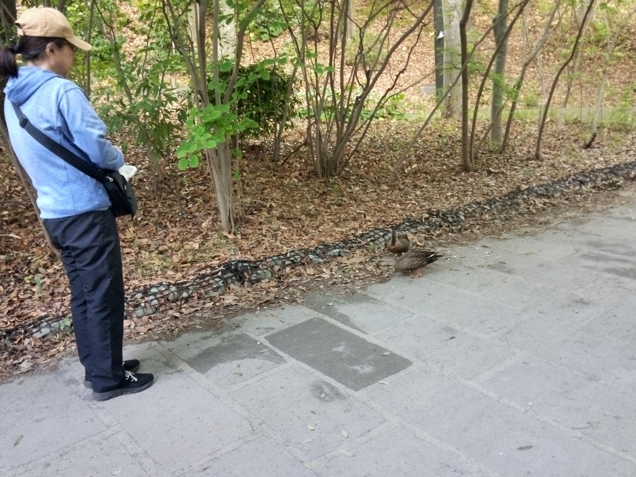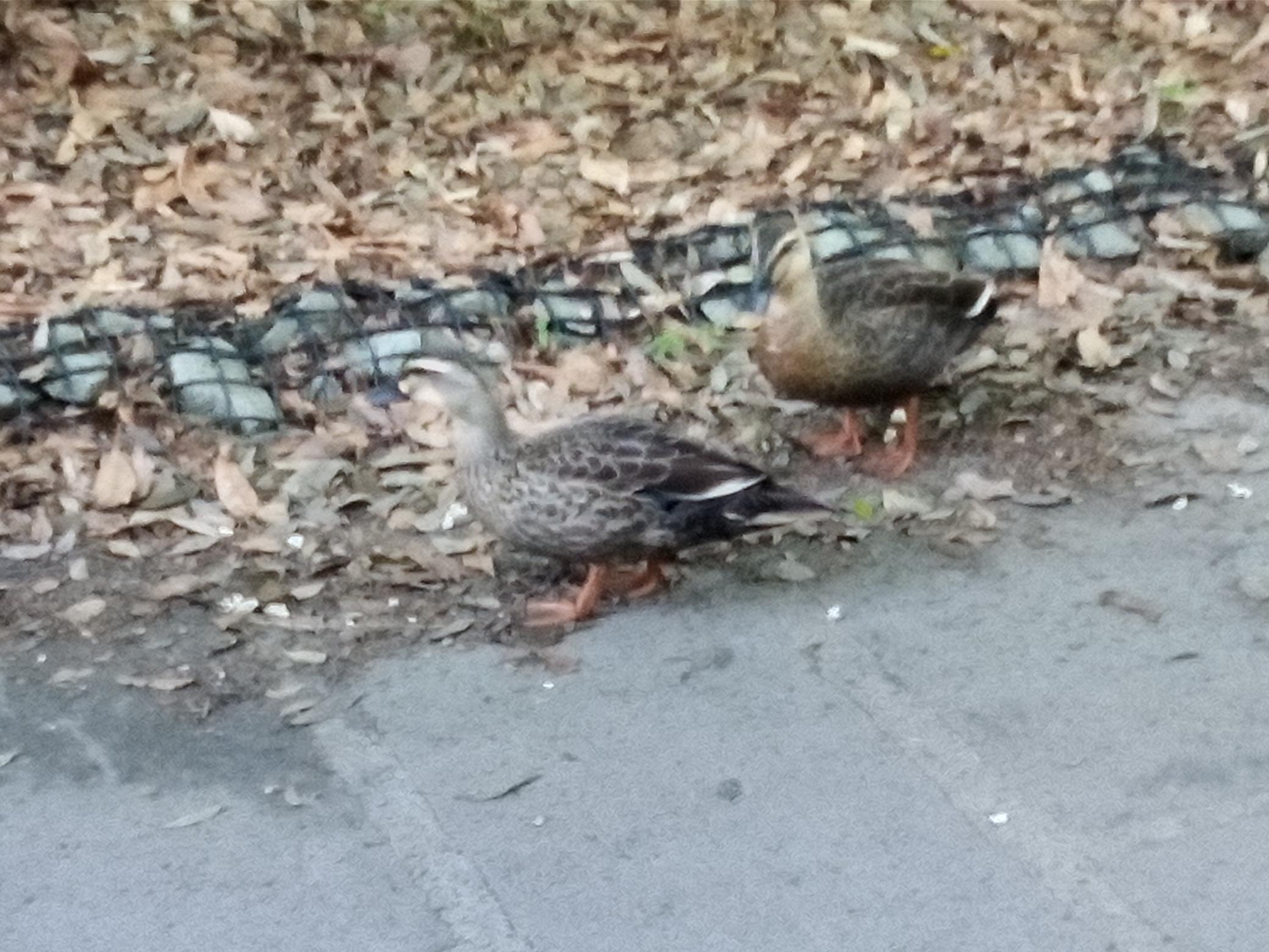 ​まんまる広場を目指して緑道を進むと、何と番の鴨が緑道で待っていました。びっくり