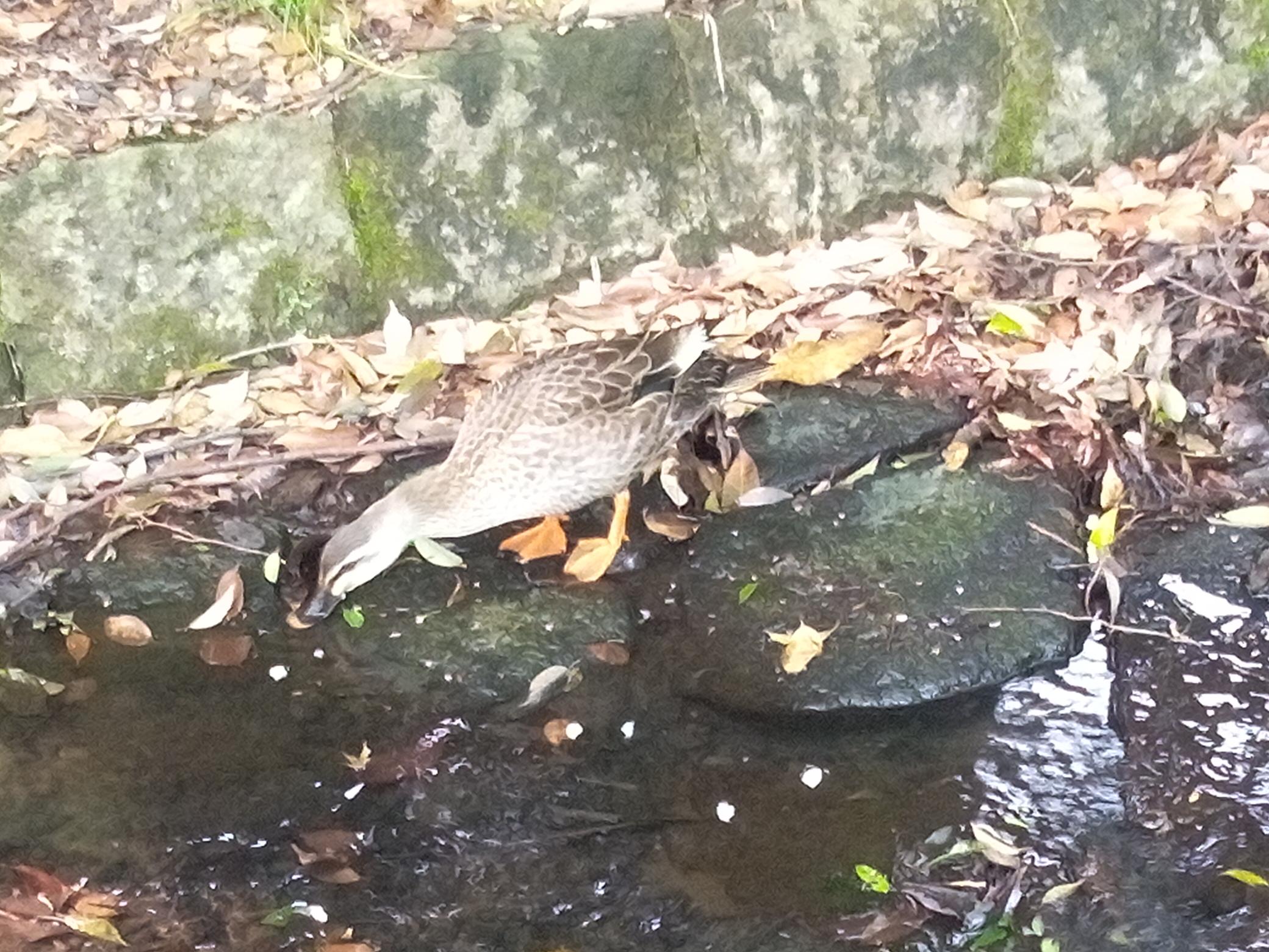 ​エサを食べつつ池へ急ぐ鴨親子。