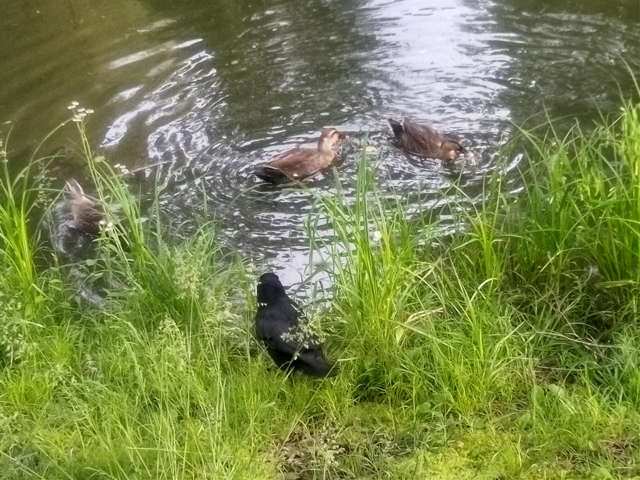 ​鴨のエサを強奪しようと狙うカラス。