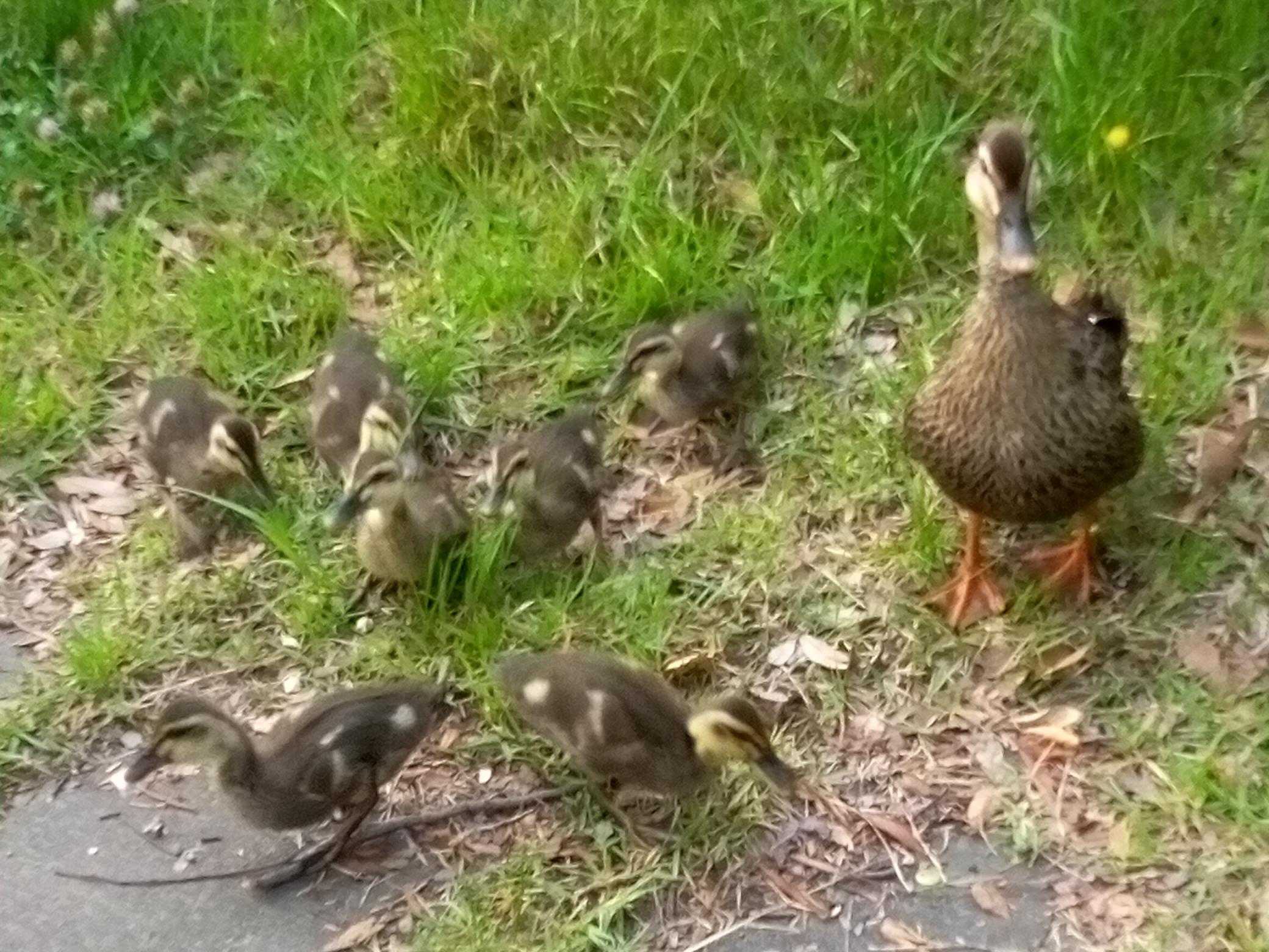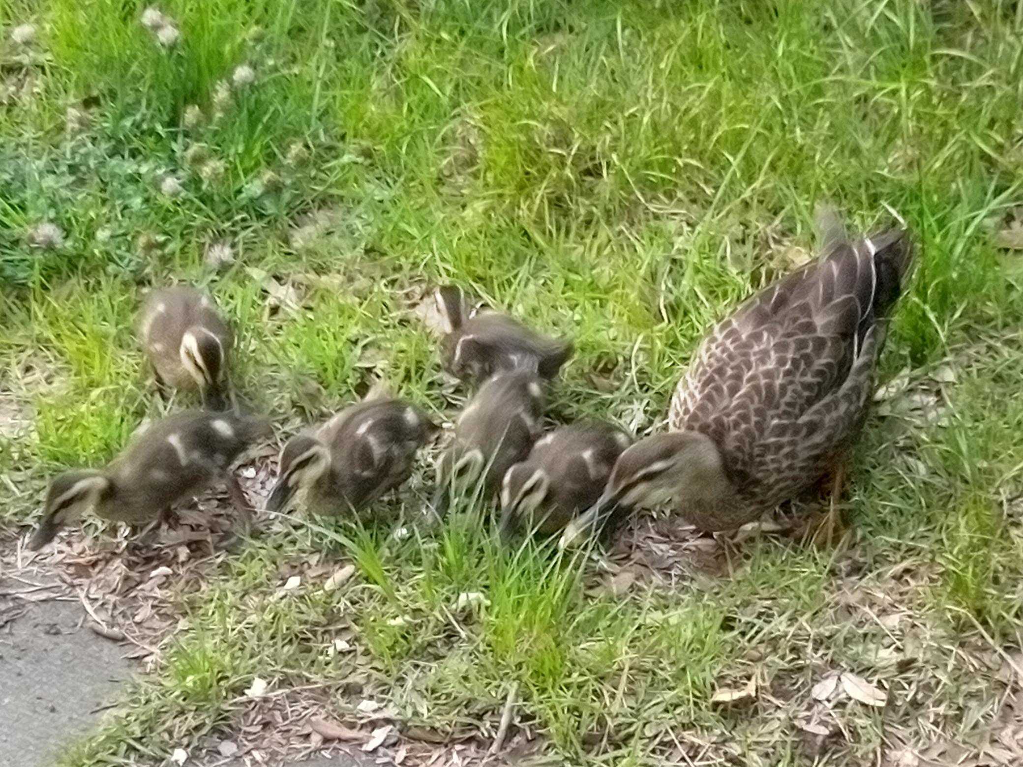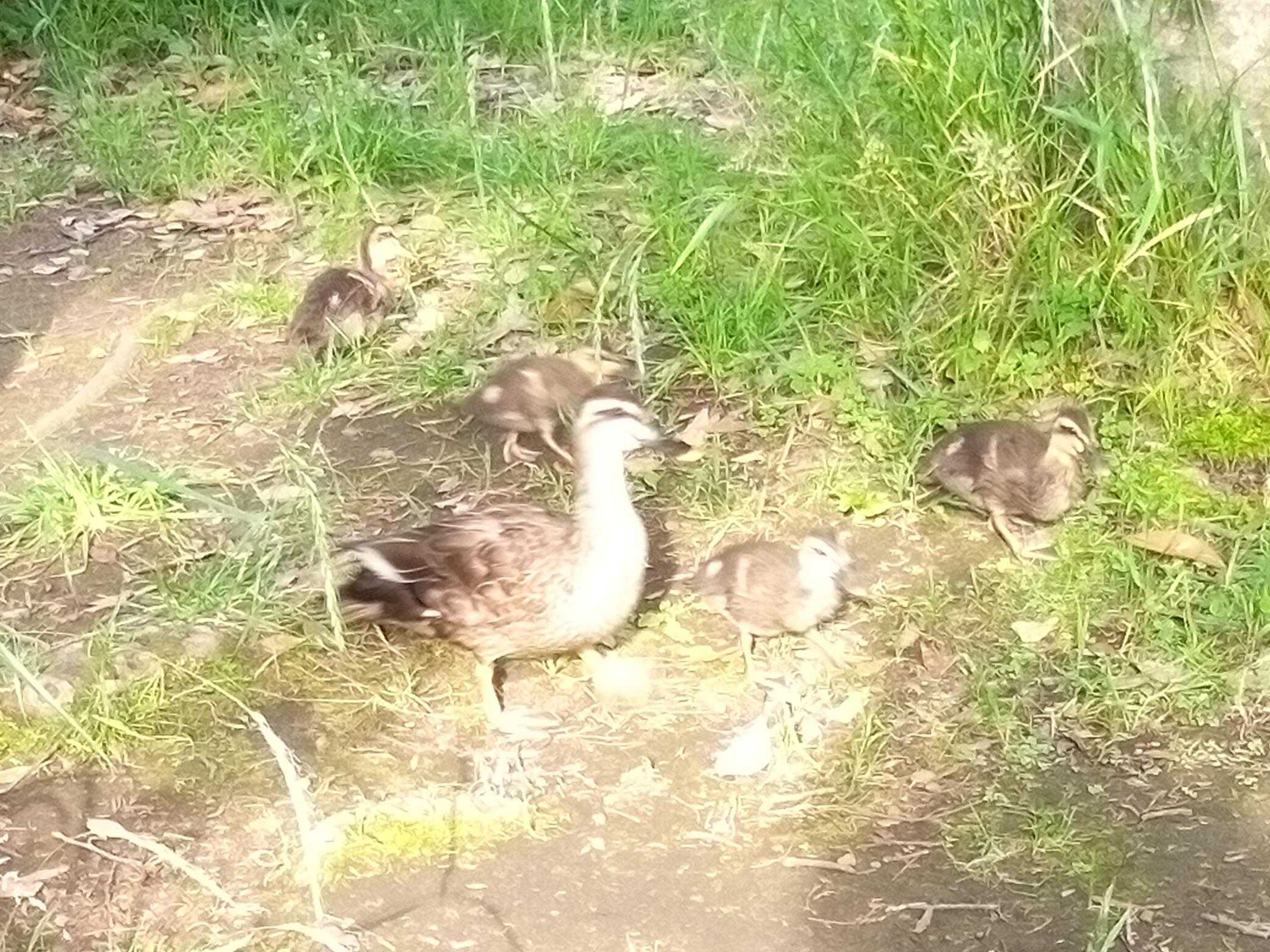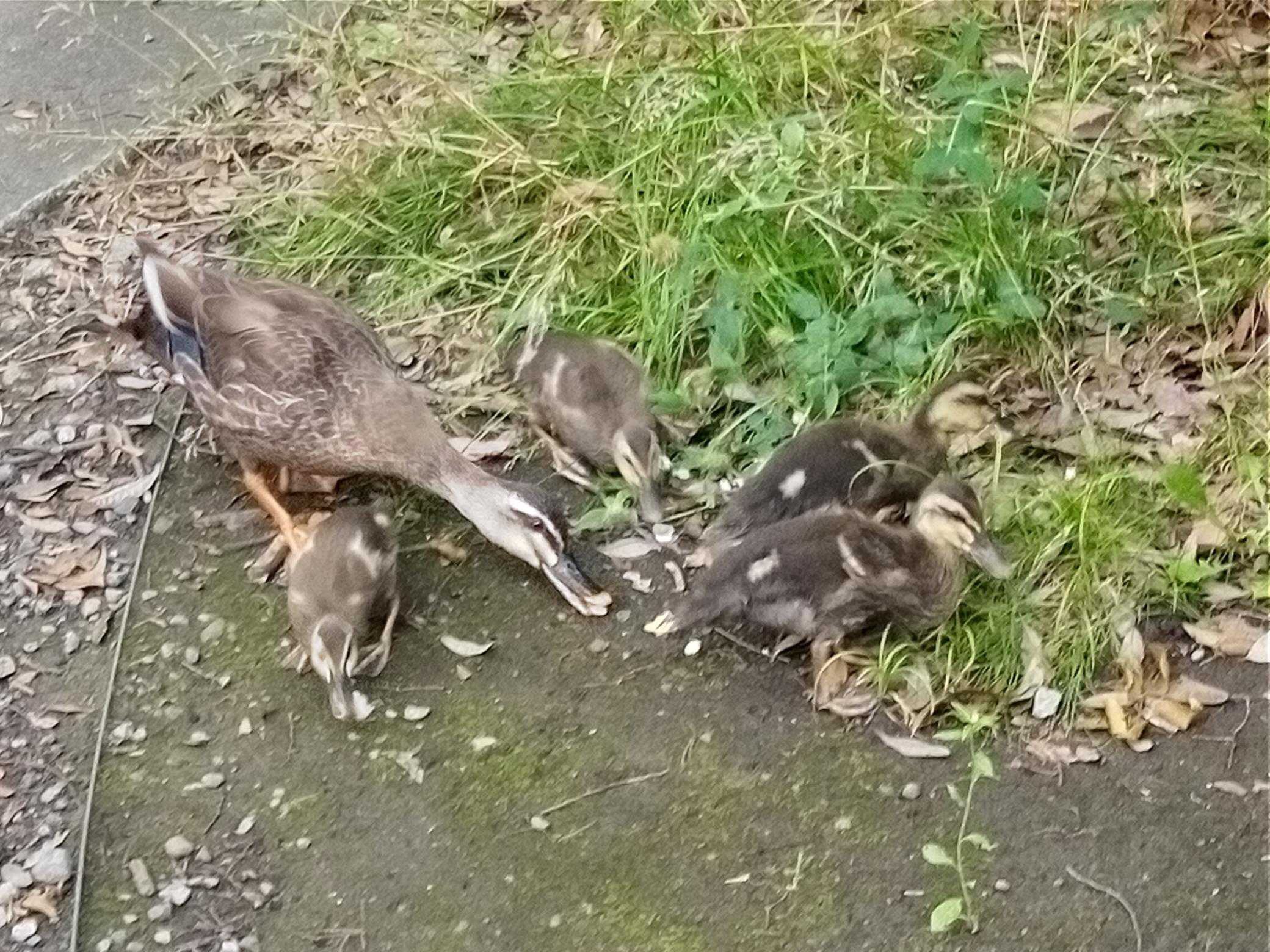 母鴨も4羽の小鴨もお腹一杯にエサを食べて池へ戻りました。大笑い