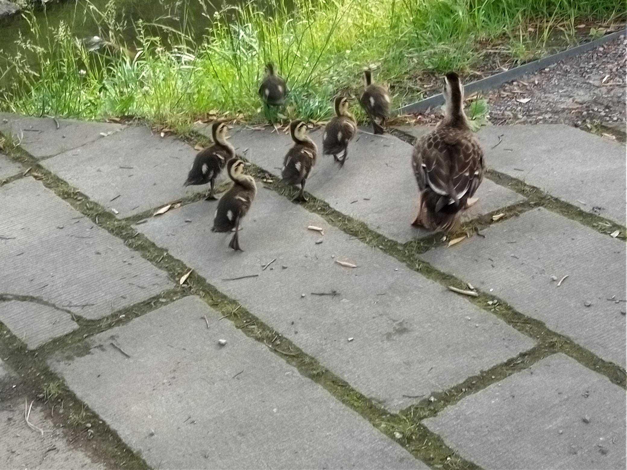 ​お腹一杯になったので池へ戻る7羽の小鴨と母鴨