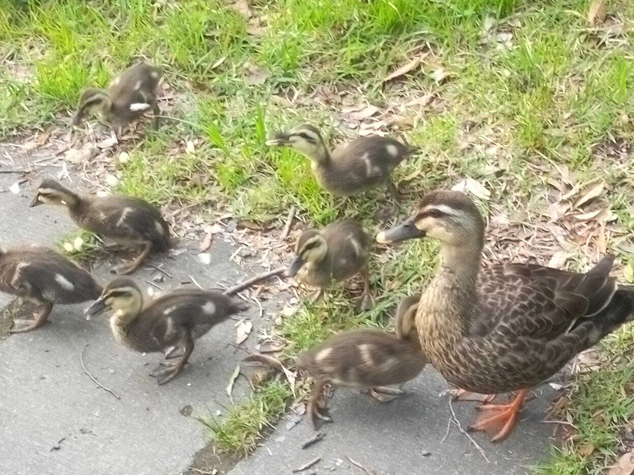 この朝、大人鴨5羽、子鴨11羽にエサをあげました。ウィンク