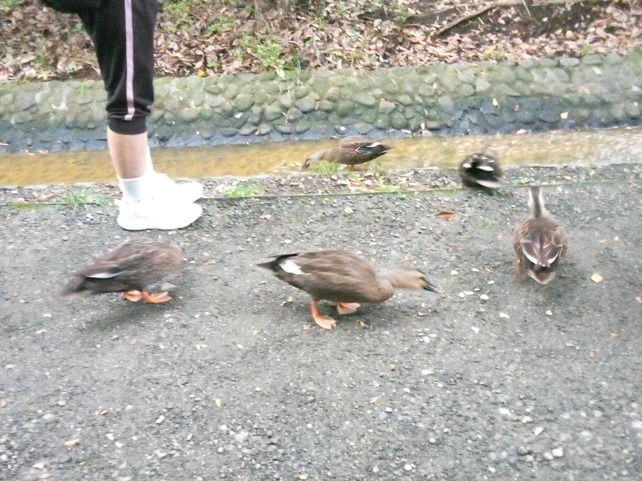 ​妻の足元へ来てオネダリする鴨達。