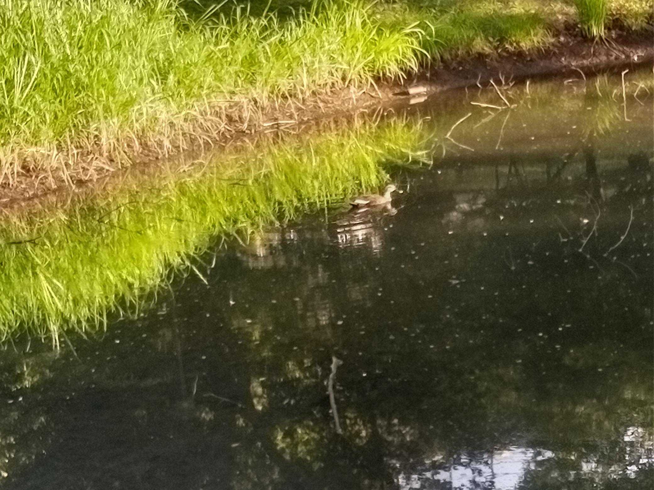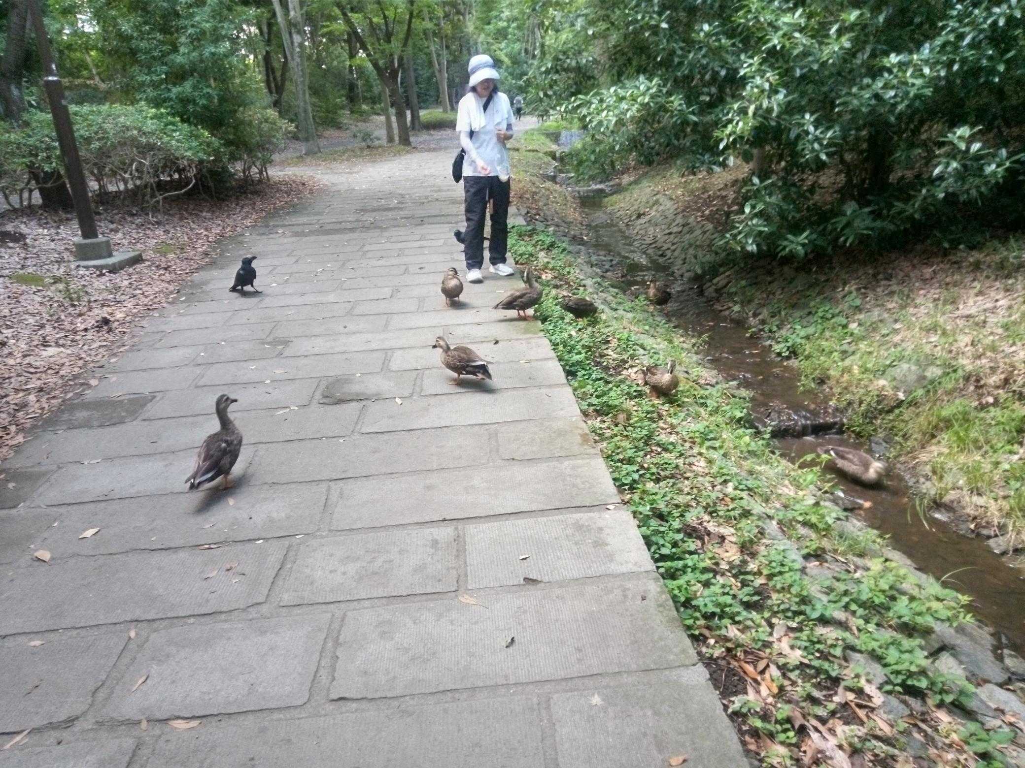 すると池へと続く小川に9羽の鴨が待っていました。ウィンク