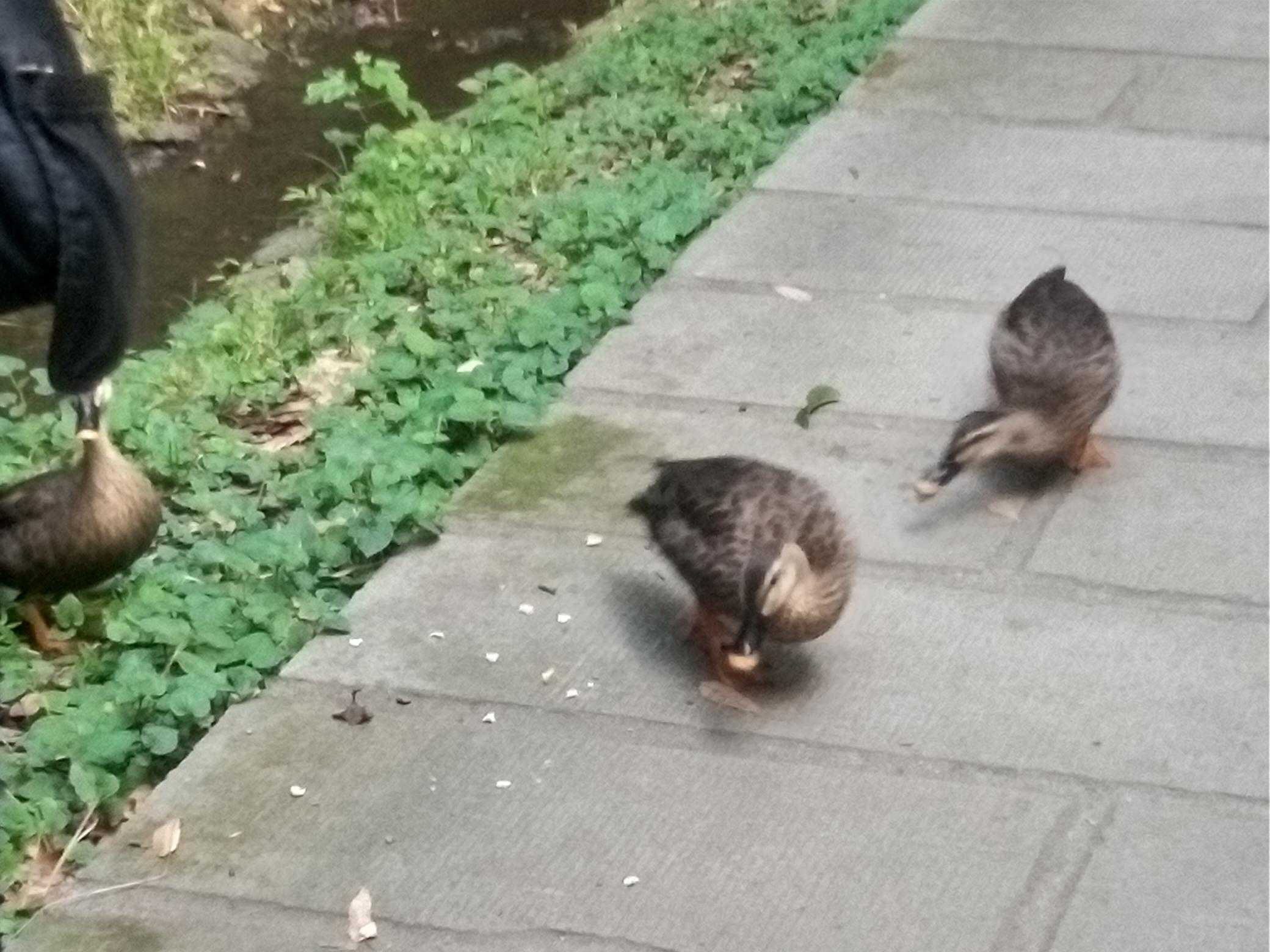 それでも9羽の鴨は元気にエサを食べました。大笑い