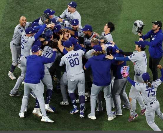 山本(真ん中の顔)に抱き着くドジャースの選手達。