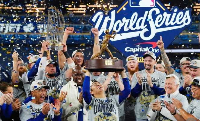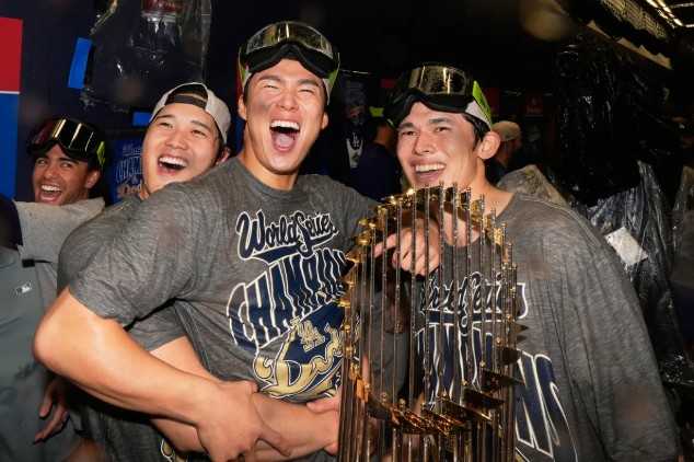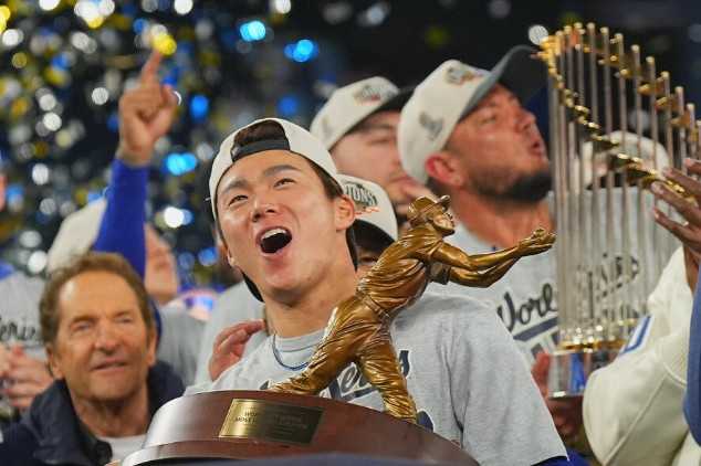 ワールドシリーズMVPのトロフィーを掲げる山本!