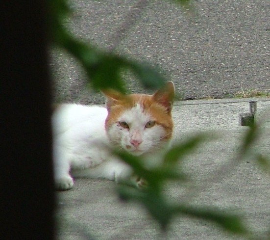日記を書いた後で、ふと庭をみたら駐車場のわが車の斜め前にノンビリと居座るネコ君。どこかの飼い猫でしょう。以前にも見かけましたが、今朝は夏バテのせいか、テコでも動かない雰囲気。窓を開ける音に気付いても、立ち上がる気配もなくジッとこっちを見ている。