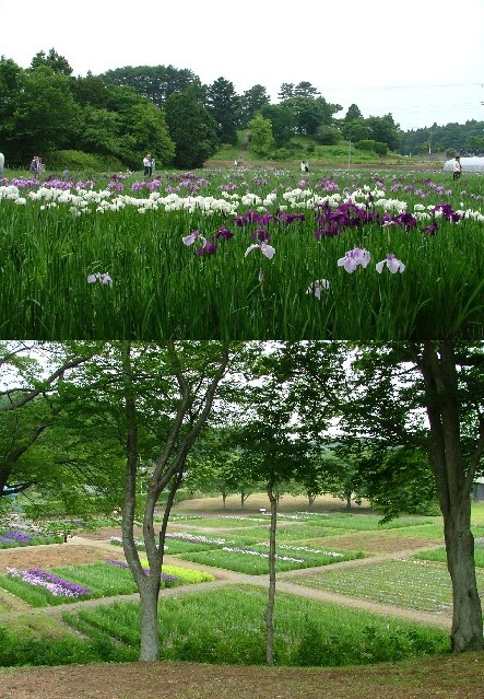 画像は、築山から眺めた東側(旧東北歴史資料館方向)が上。下が、築山から西方向(壺の碑方向)です。