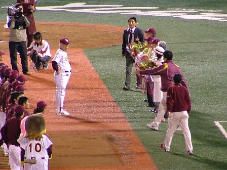 しかしチームのメンバーが三本間に並んで、監督や選手代表に花束。そしてサッサとベンチに引き上げてしまった。2万人が呆気にとられたのではなかったか。レフトスタンドには説明を求めるファンがいつまでも残っていた。