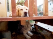 娘の美紗子が撮った写真です。庭にあるログハウスのテラスで気持ち良さそーーーーーーにお昼寝しているのがウィンディ(ラヴ・♀・10歳?)テラスの下で、賢いふりしてるのがミルク(ワイヤー・♀・9歳?)ウィンディはおとなしくお目目がとっても可愛いラヴ。ご近所のラヴの中では、ピカ一の美人ミルクは気が強くって、もうオバさんにも拘らず元気いっぱい走り回っていますどんなに疲れて帰っても、彼女たちのお気楽な顔を見るとスーーーーっと疲れが消えてしまう初めての親バカ・犬バカブログでした