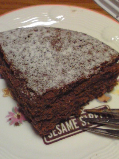 今日は会社はロールケーキのおやつだよ!(b^ー°)って言われてたから、張り切って出勤したらお店が定休日だったんだって(;>_<;)おやつが無い~!Σ( ̄□ ̄;)暴れるよΣ( ̄ロ ̄lll)騒いでたら、クッキー食べる?って言われた・・・(ー_ー;)クッキー???ロールケーキの気分なのに、クッキー???お腹がペコちゃんのまま、裏のおばあちゃんのお通夜の帳場のお手伝い。お腹が空きすぎて、疲れはてた( -。-) =3こんな時は甘いもの!(b^ー°)フォンダンショコラケーキ売ってた(≧∇≦)直径15センチってとこかな?うーん、ショコラだよ~o(`▽´)oスゴいしっとりした生地((o(^∇^)o))なめらか~(≧∇≦)表面には雪化粧を施したニクい仕上げo(^o^)o疲れも吹き飛ぶ(*^o^*)美味しいo(`▽´)o明日も帳場、頑張ろう\(*⌒0⌒)b♪