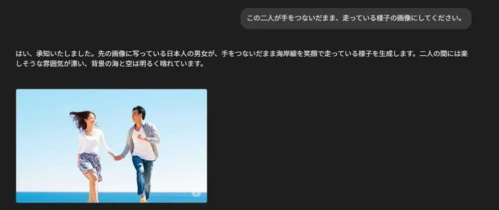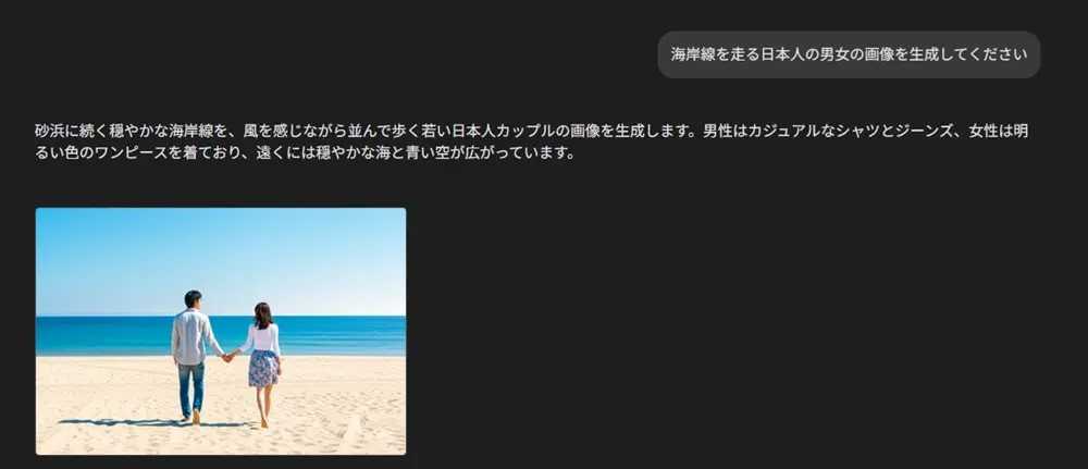 例として「海岸線を走る日本人の男女の画像を生成してください」と入力したところ、
