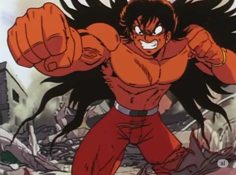 男性の主人公と怪物が闘っている様子の画像を、日本の1980年代のアニメ風に生成してください