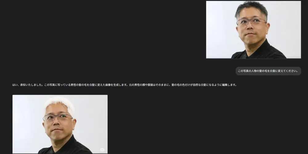 試しに筆者の写真をもとに「髪の毛を白髪に変えてください」と指示をした結果が以下のとおりです。