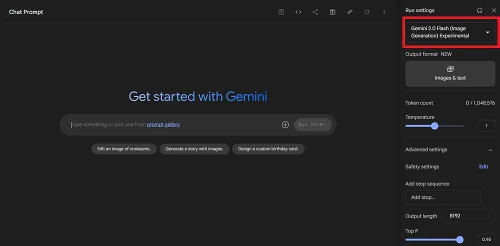 まずは​ Google AI Studio ​のサイトに移動し、画面右上の「Run Settings」から「Gemini 2.0 Flash (Image Generation) Experimental」を選択します。