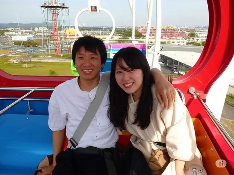 遊園地の観覧車に乗っている日本人の男女の写真を写実的に生成してください