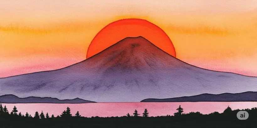 富士山の後ろから太陽が昇る景色を、水彩画風にして生成してください