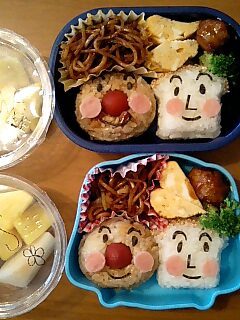 今日も土曜保育に行っていただいてますだんだん寒さもキツクなってきて朝起きるのがしんどいお母さんです・・・今日のお弁当はコレ!!【アンパンマンと食パンマン】弁当まずアンパンマンのおにぎりには、鰹節と醤油を混ぜてオカカおにぎりになっています♪鼻には小梅ちゃんが埋め込んであって、ほっぺにはハム。食パンマンのおにぎりは、塩をまぶして中にツナマヨを入れて・・・って思ってたら、忘れましたそれに気付いたのは、おチビ達を保育園に連れて行き仕事へ向かう車の中しかも、そのツナマヨを冷蔵庫にしまうのも忘れています・・・おにぎりは塩味のみ。食パンのミミの部分には白ゴマをくっつけただけなので超~シンプルなおにぎりとなりました今夜おうまっくすからクレームがきそうで怖いわ~今日のおかずは・・・【焼きそば・鶏つくね・だし巻き玉子 ブロッコリー・梨・パイナップル】朝、こっそりお弁当をのぞいていたさわぞ~は”えへへ~”と、変な笑いをしていました・・・そろそろお弁当の時間でしょう。今日も満足していただけてるのでしょうか???