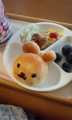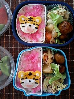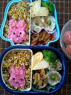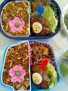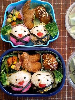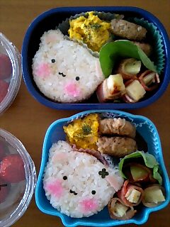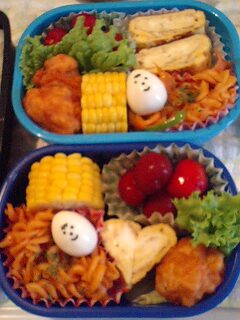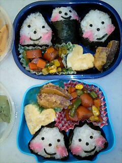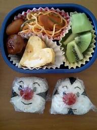 今日はおうまっくす達、幼児クラスの子達は【園外保育】の日です。さわぞ~達の乳児クラスにはないんだけど、幼稚園部の子達と一緒になって近くの公園までちょっと遠足っぽくお出掛けします。今日の【園外保育】はお弁当持ちということで朝から頑張りましたよ~ある程度の準備は前夜にしておいたのでまぁ15分くらい早く起きればいいや・・・なんて思ってたら大間違いでしたす~っごく必死に、時間に追われながら作りましたよ!!お父さんのお弁当が完成するのが出勤時間に間に合いそうになく朝のコーヒーもインスタントで我慢してもらいましたやっぱ最低でも30分は早く起きなきゃダメね・・・(反省)今日のおにぎりは【おむすびまん と こむすびまん】です。コレに結構時間を取られました以前に作ったのと違うのは、鼻が梅干になってる事です。『カリカリ小梅』ちゃんを半分に割って、のせてあるので立体的な顔に見えるよ近頃のおチビ達は、この『カリカリ小梅』にはまっているようです。もう、ふりかけは卒業かな???そして、今日のおかずは【ウィンナー入りナポリタン・だし巻き玉子・ミートボール キウイ】です。外は昨日よりあったかいし、風もないし・・・きっと楽しい【園外保育】になるでしょう!!・・・さぁ、また明日も土曜保育だからお弁当作らなきゃ明日は何にしよう???
